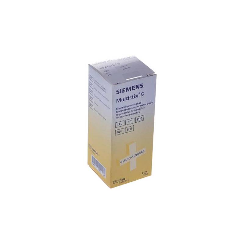 The Multistix 5 test from Siemens is a high quality and widely used urine test for the determination of Blood, Glucose, Protein, Nitrite and Leucocytes in urine. Through a colour change on the strip, even the smallest pathological abnormalities or changes become visible. The Multistix-5 urine strips from Siemens are known for their high reliability.