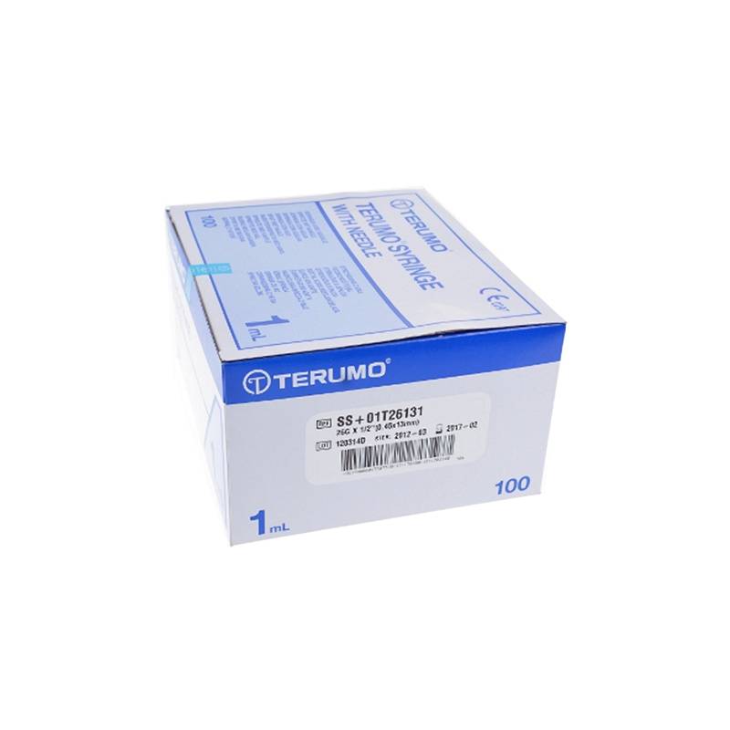 The Terumo Three-part syringes with inserted needle can be used for multiple applications. The Terumo Three-Part Syringes with needle can be used for taking blood and injecting fluids and medicines. This can be done in the muscles, veins, fat tissue, skin and heart muscle. The Terumo Three-Part Syringes with needle are packaged sterile each. High quality; Highly transparent syringe; Ergonomic finger grip; Very precise dosage; Sterile packed per piece; With luer tip, Volume 1mL, Centric, 26 G needle. 100/box,
