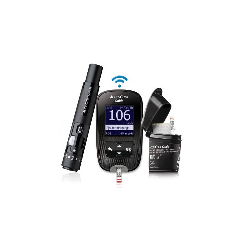 De Accu-Chek Guide startkit bevat: 1 Accu-Chek Guide bloedglucosemeter. 1 Accu-Chek FastClix prikker, 1 lancettenhouder met 6 Accu-Chek FastClix lancetten, 10 Accu-Chek Guide teststrips, 1 opbergetui, incl. 2x batterijen,